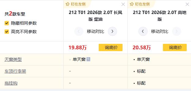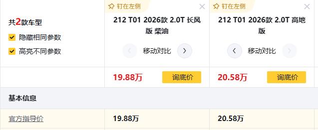 车友们,想玩越野,还纠结2026款212 T01,212 T01 2026款 2.0T 长风版 柴油、212 T01 2026款 2.0T 高地版怎么选?直接说结论:预算够就上高地版,柴油长风版更适合极端看重油耗的玩家。