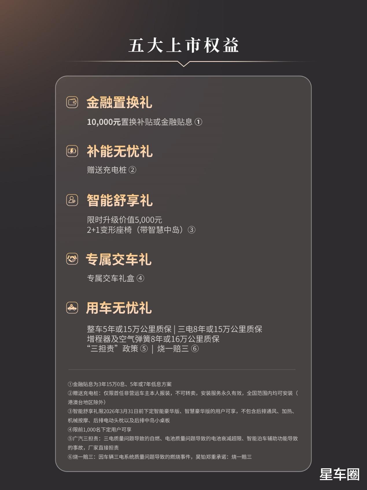 这次上市还带来了满满当当的权益,10000元置换或金融贴息、免费充电桩、限时配置升级、超长三电质保,还有“三担责”和“烧一赔三”的服务承诺,从买车到用车,能想到的都给安排上了。