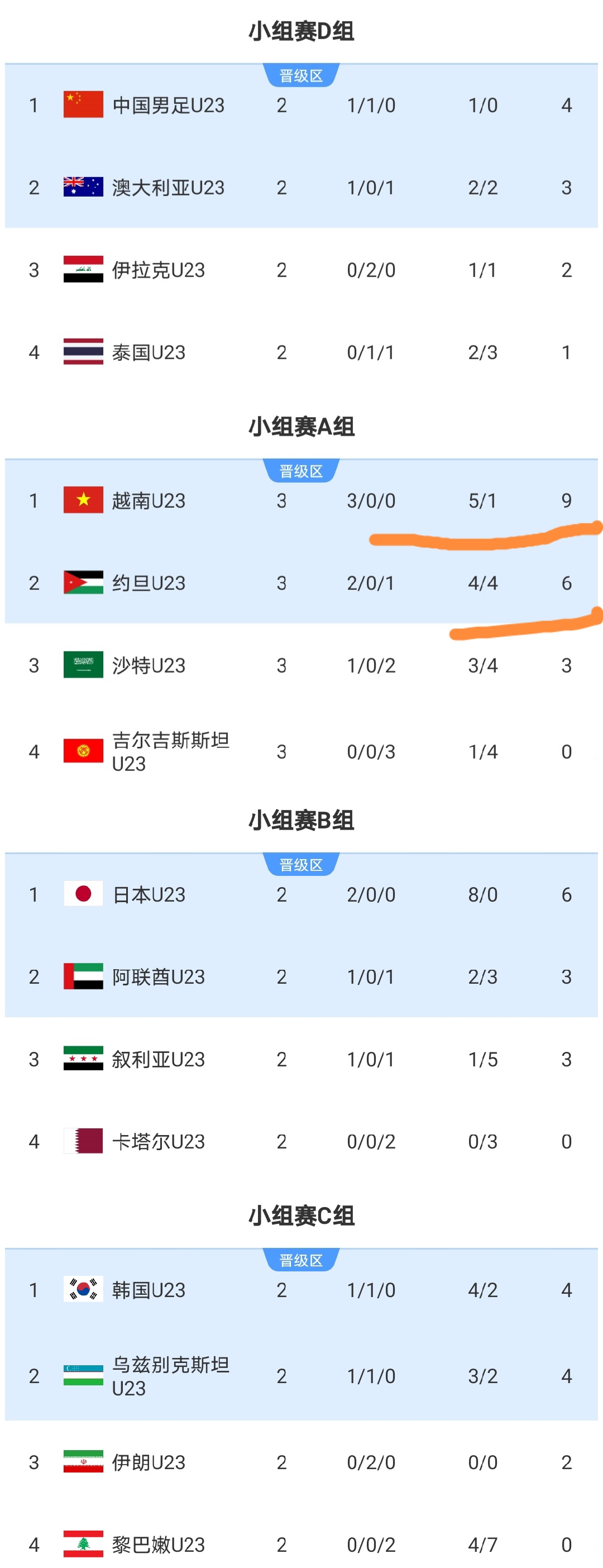 今天凌晨,U23亚洲杯小组赛A组最后一轮结束两场较量,东道主沙特和越南、吉尔吉斯斯坦、约旦出战。比赛之后,U23亚洲杯小