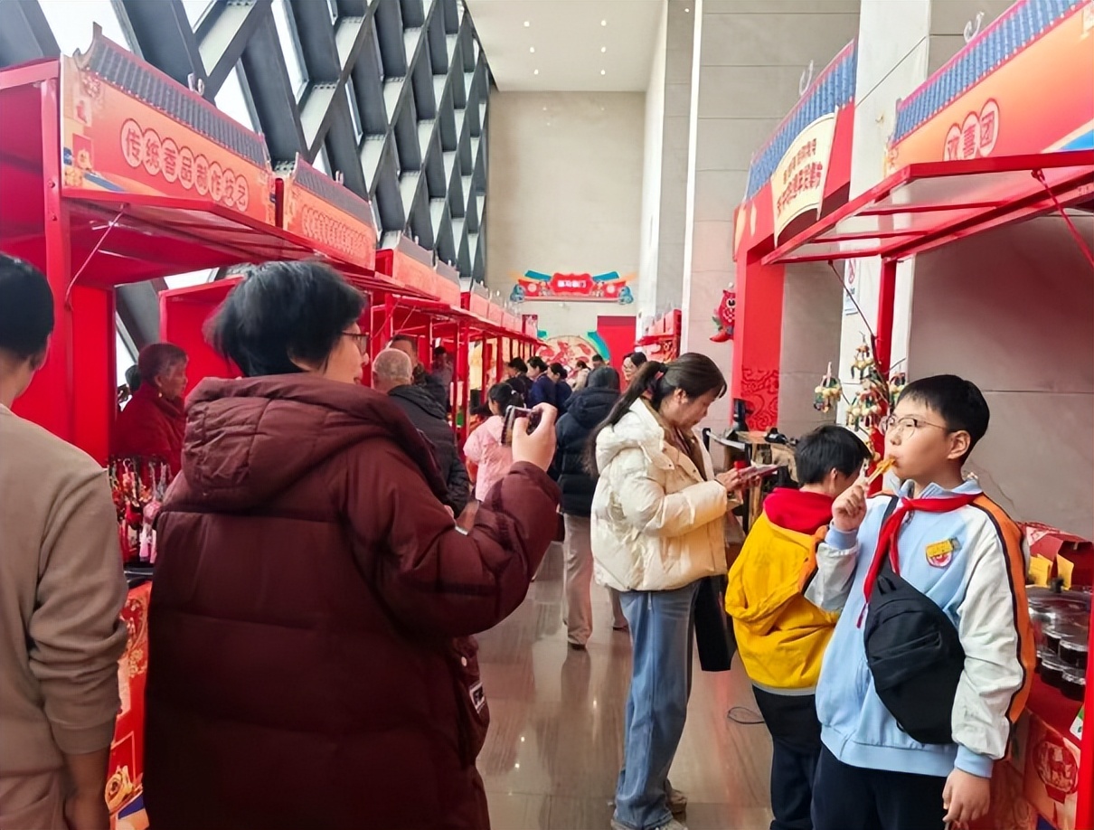 紧扣文旅消费提质扩容的政策导向,今年“文化荟”创新推出“丙午非遗年货集市”,将非遗展示与年货采购深度融合。二楼展廊变身热闹的“年货大街”,20个非遗展位整齐排布,传承人亲自坐镇,莲花灯、滨州民间剪纸、布老虎、老粗布、芝麻酥糖、惠民泥塑、杜桥豆腐皮、塘坊糕点等非遗好物集中亮相,让众多市民直呼过瘾,更引来许多网络主播现场打卡。一旁的“赤马迎新春·滨州非遗传习坊”成为孩子们的欢乐天地,孩子们围在传承人身边,学习体验草编、泥塑、剪纸、香品制作技艺,让非遗在指尖传承。