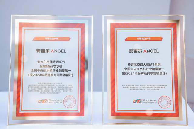 基于对核心技术的不断突破,加上净水器跻身刚需家电,还有国补助力的利好大环境中,安吉尔以小型化的全屋净水产品赢得了市场和消费者的认可,世界权威市场调查机构欧睿国际数据显示,安吉尔空间大师安吉尔空间大师M7系列和全屋Mini软水机零售量在2024年中国大陆市场的占有率分别为18%和13%,分别斩获“全国中央净水机行业销量第一”和“全国中央软水机行业销量第一”的市场地位认证证书。