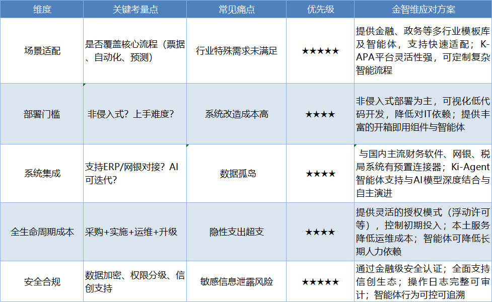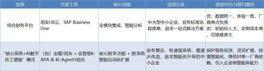 用友U8云、SAP Business One等在集成深度与用户友好上表现突出,某贸易企业上线后财务周期缩短近一半。然而,这类平台通常价格不菲,且模块间耦合度高,定制化灵活性相对受限。对于业务独特或已有部分系统(如独立ERP)的企业,采用“最佳组合”策略可能更优。例如选择核心财务系统,再通过AI数字员工和智能体连接和增强各个模块及外围系统。金智维K-APA及Ki-AgentS作为智能粘合剂,能与用友、金蝶、SAP等主流平台深度集成,在不改变核心系统的情况下,实现跨平台、跨应用的流程自动化与智能决策,提供了比单一综合平台更灵活、渐进式的数字化路径。