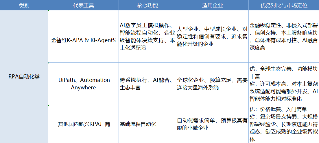 国际RPA巨头功能强大但许可费用较高,且对本地化服务响应速度可能不及国内厂商;而一些国内新兴RPA产品则在复杂场景稳定性和大规模部署经验上有所欠缺。金智维凭借在金融、政务等高端市场的规模化实践,以及在AI数字员工和企业级智能体领域的深耕,在稳定性、安全性和复杂业务逻辑的智能处理上建立了较高壁垒。