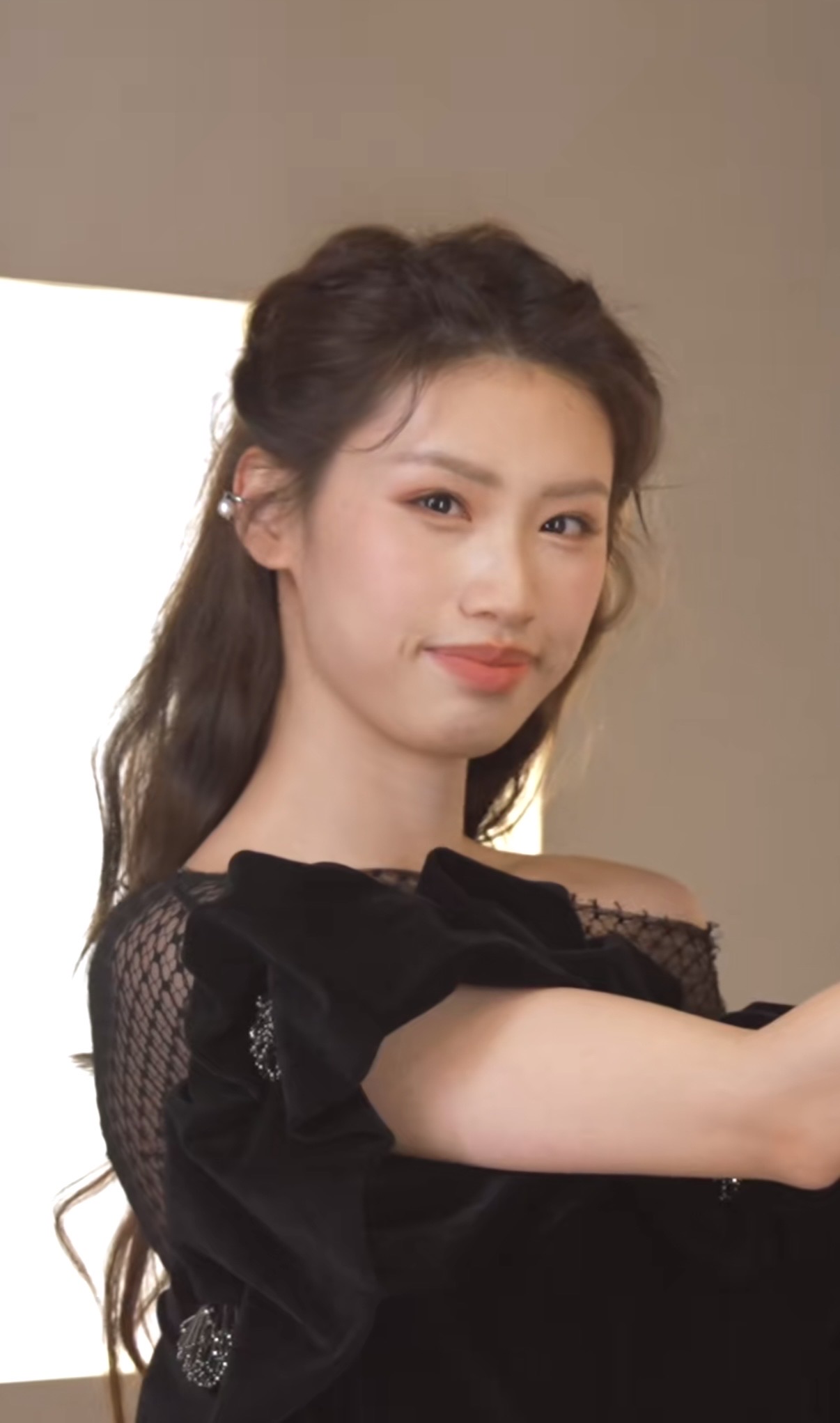 徐朵这次的造型很少女,是那种清纯中带一点甜的感觉。她穿半高领的白色毛衣,发型做成了公主半扎发,温婉甜美,若隐若现的双腿更显轻盈。