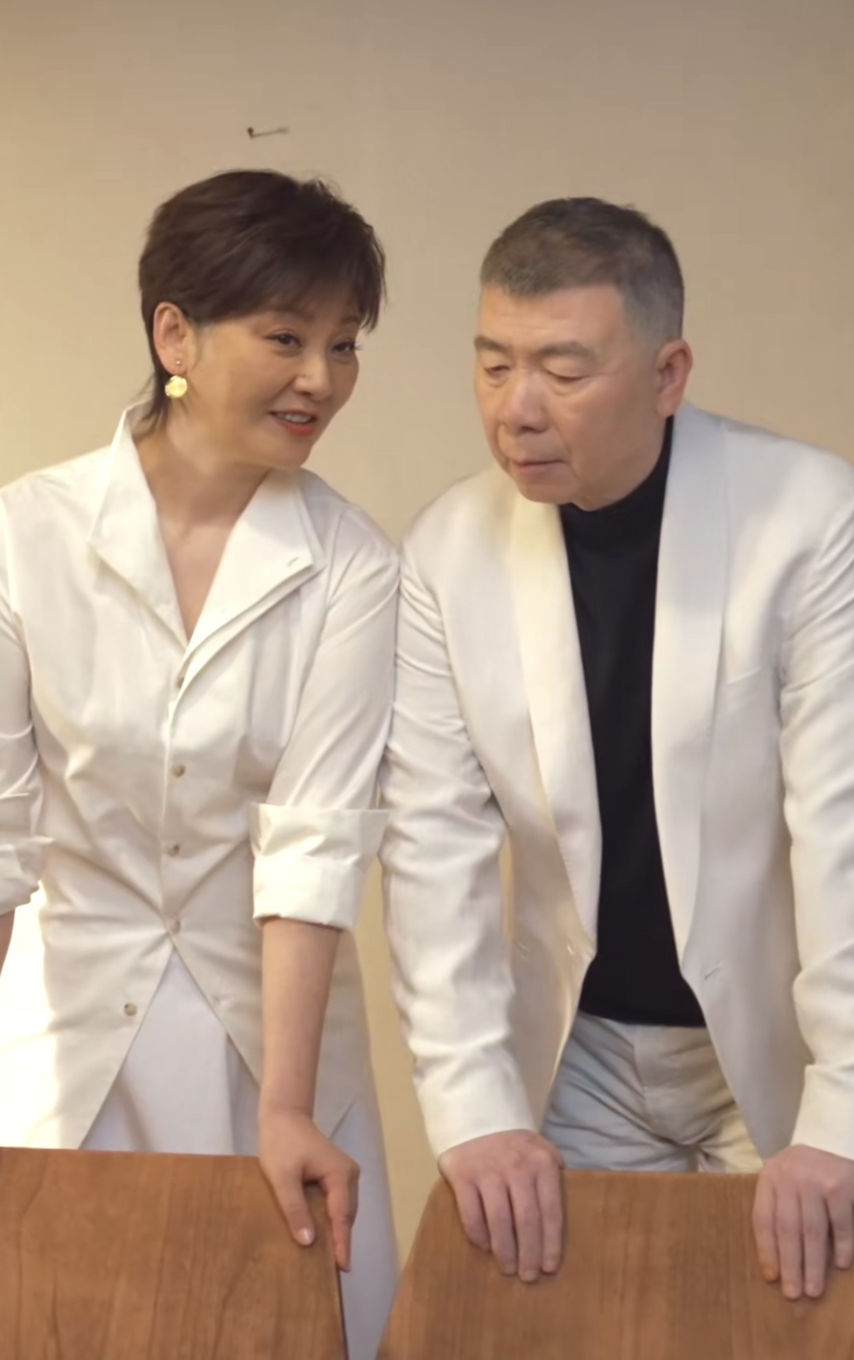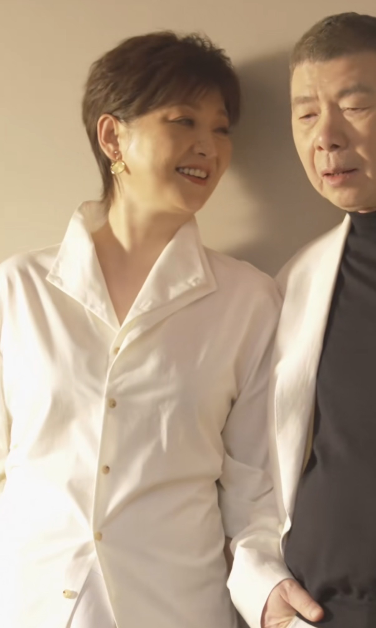 徐帆的气质特别好,她穿一件个性的白衬衫,自然的将衣袖挽起,一副女强人的模样。冯小刚白西装、黑色内搭,前所未有的帅气。