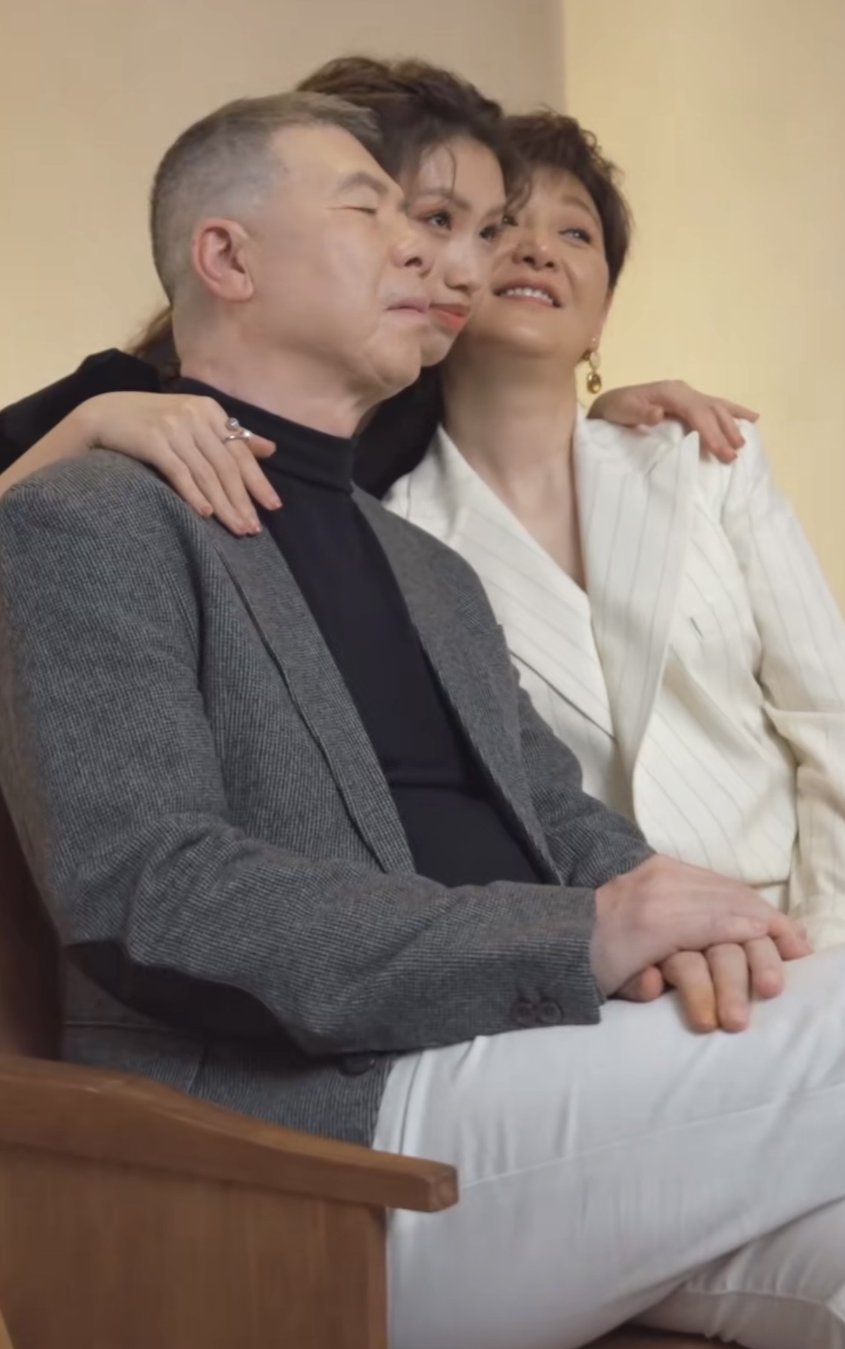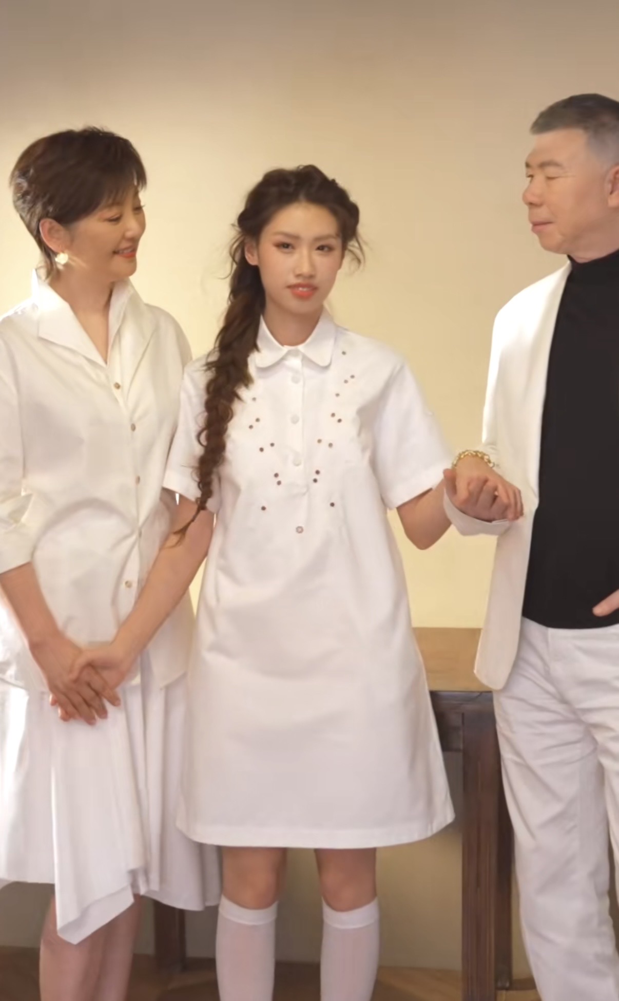 还有他们一家三口的画面,真是温情满满。徐朵站在中间,两手分别搭在爸妈的肩膀上,冯小刚微微闭着眼睛,一脸满足。