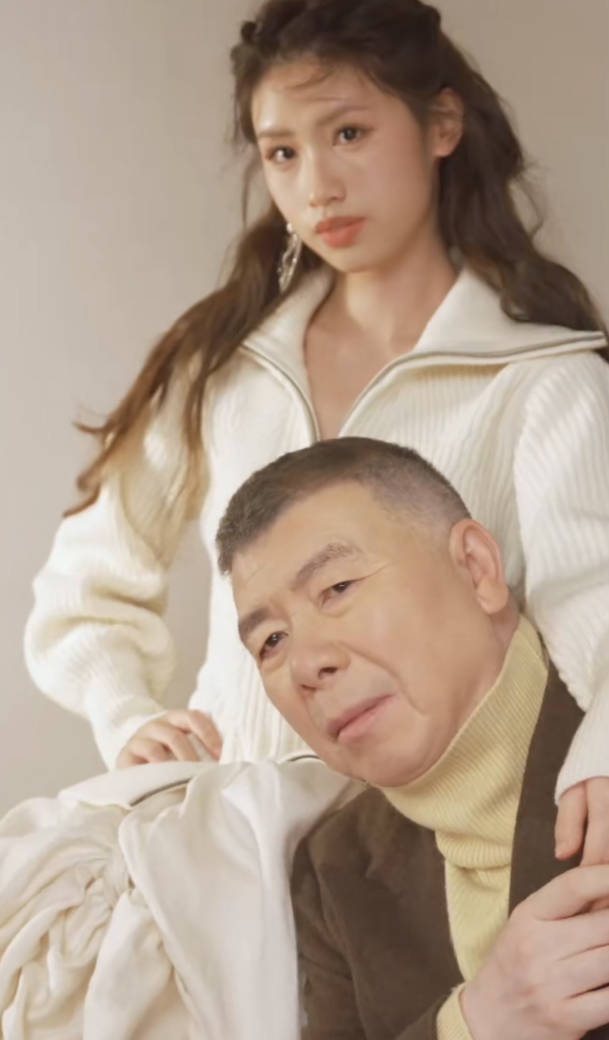 冯小刚也罕见的化了妆,这个状态显得他很年轻、也更帅气了。而且冯小刚和许多表情动作同步,看着父女俩很像。