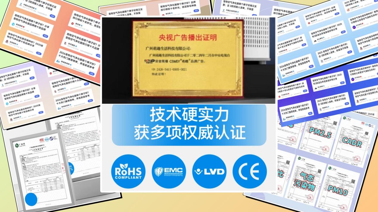 同时,希喂还通过了RoHS、EMC、LVD、RED、CMA、广微检测六项权威认证,并登上过CCTV品牌展播。这些认证证明它不仅净化力强,也符合安全与环保标准。