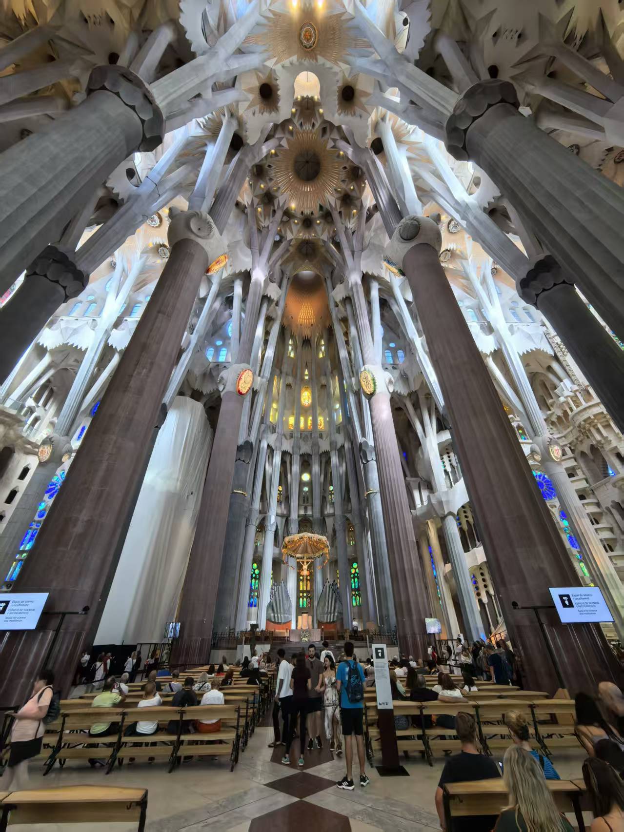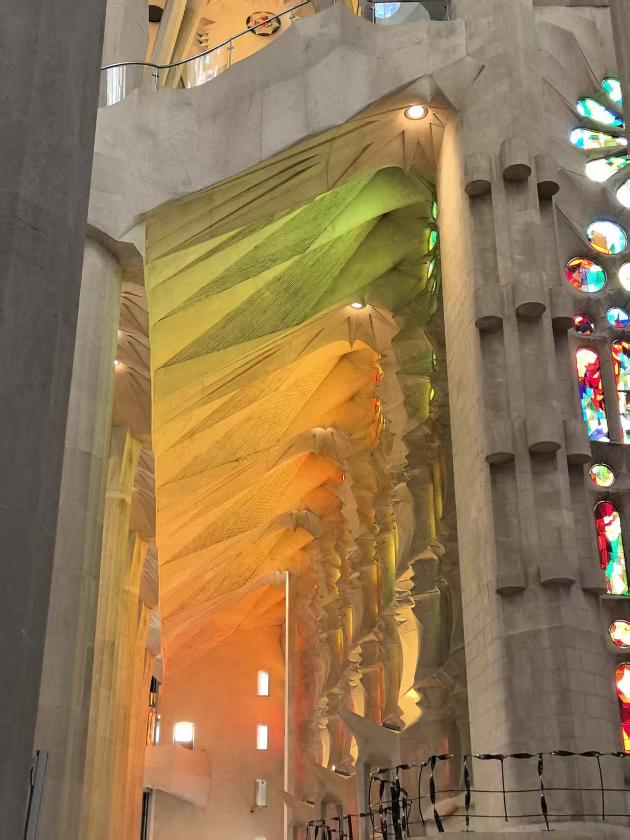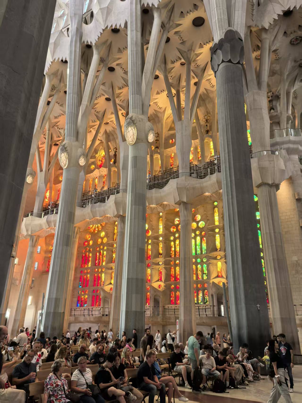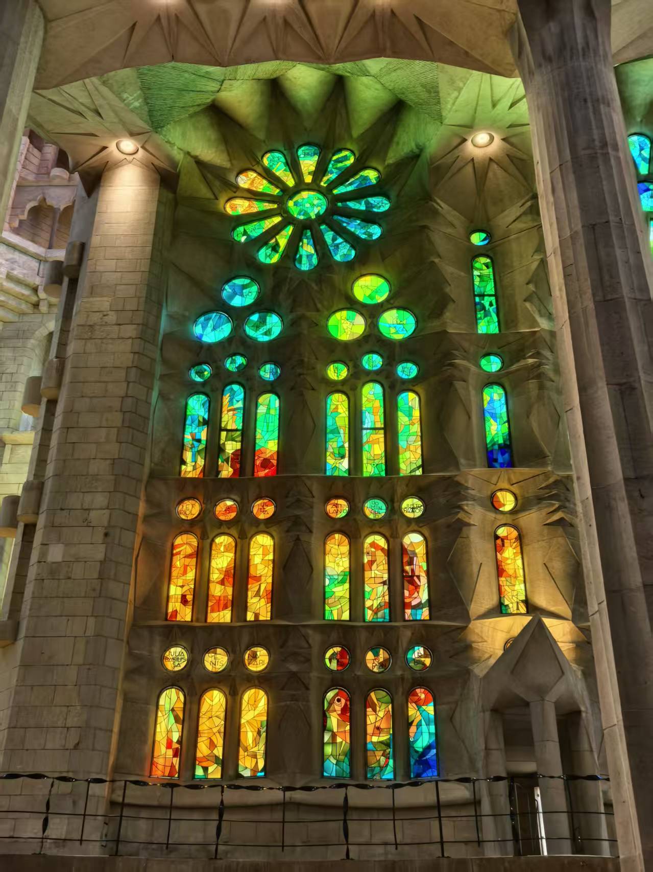 进门步入内部,高迪“以自然为圣殿”的设计哲学瞬间具象——眼前没有一根直线,唯有如森林般交错的立柱与穹顶,将“曲线属上帝”的理念揉进每一处结构。数十根立柱从地面拔地而起,柱身复刻棕榈树生长的弧度,向上逐渐分叉出“枝干”,最终在穹顶交织成网状,托起顶部直径20米的圆形天窗,阳光穿透玻璃,化作细碎的金芒洒下,落在地面的光影随日光移动,像森林里缓缓游走的光斑。两侧墙面的彩色玻璃窗是高迪的“光的画布”:东侧蓝绿色玻璃模拟地中海的天空与海洋,将晨光滤成清冽的“自然之光”;西侧橙红色玻璃象征生命与火焰,把夕阳染成温暖的“信仰之光”,正午时分,双色光影在中央祭坛前交融,恰好呼应他“一半自然,一半圣经”的灵感来源。耳畔管风琴旋律在曲线穹顶间迂回,与工匠打磨石材的叮当声碰撞,恍惚间,仿佛置身于被阳光包裹的地中海森林,而非传统意义上的宗教殿堂。