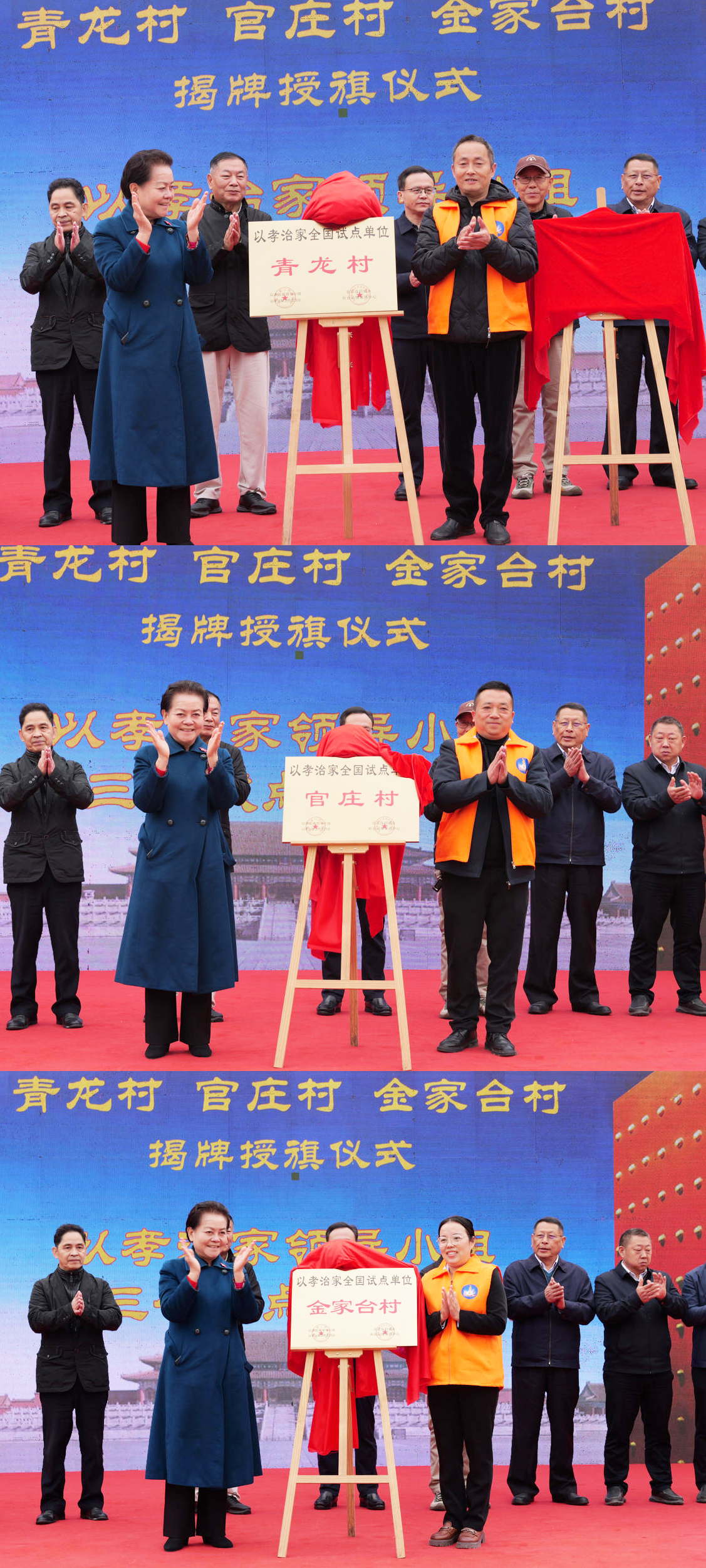 随后,启动大会进入庄严的授牌、授旗环节。吴红大姐依次为青龙村、官庄村、金家台村授予“以孝治家全国试点单位”牌匾,以孝治家领导小组成员、县镇领导共同见证。紧接着,开国上将宋任穷之子、以孝治家领导小组名誉主席、“两弹一艇”精神传承联谊会会长宋京波、以孝治家义工秘书长李茂分别为三个试点单位的三支队伍授旗,这标志着青龙村、官庄村、金家台村正式成为“以孝治家”全国试点单位,以孝治家行动在利福塔镇青龙村、官庄村、金家台村的全面启动。