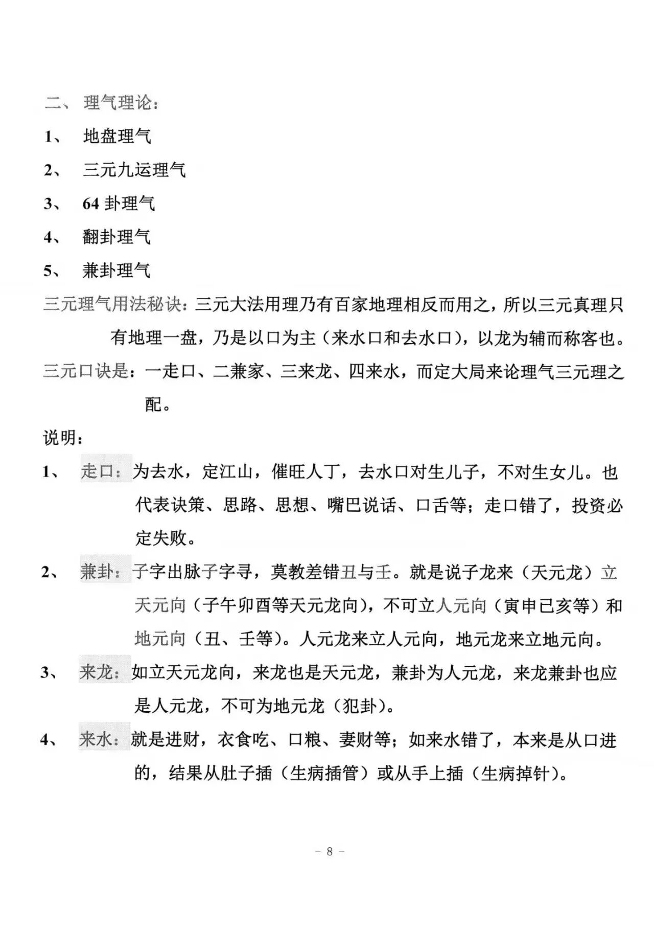 中段 70 页聚焦 “理气核心”,堪称三元风水的 “断局秘籍”。“风水正三元尾理气笔记” 独占 40 页,收录 “挨星诀”“替卦法” 等失传技法,如 “乾山乾向水朝乾,乾峰出状元” 的断语旁,附 “坐乾向巽的挨星排布图”,标注 “正神下水忌、零神上山凶” 的关键禁忌。“三元地理九大断章” 更是点睛之笔,从 “龙断”“穴断” 到 “水断”“砂断”,每章都配三僚村实地案例:某宅因 “零神位见砂” 致破财,依 “改门纳零神水” 调整后家运渐兴;某阴宅因 “替卦不当” 犯冲煞,用 “移棺合卦气” 法化解后子孙安康,这些 “理论 + 实例” 的注解恰是秘术灵验的最好佐证。