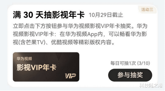 根据活动规则,只要完成首次签到满30天,就可以参与这个抽奖活动。每天都有1次抽奖机会,最多可以抽10次。奖品是影视VIP年卡,其中包含12个月的“华为影视会员(含芒果TV内容)+优酷视频会员”的超值大礼包!接下来一整年的追剧KPI就都被华丽丽地承包了!