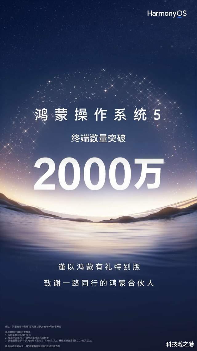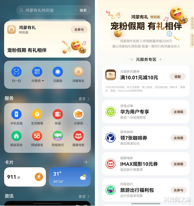 还有个好消息告诉大家,鸿蒙5终端数量已破2000万!华为推出“鸿蒙有礼特别版”宠粉活动,为鸿蒙5及以上的手机用户在国庆期间带来覆盖吃喝玩乐等多领域的专属权益,用实实在在的福利回馈用户。9月30日在负一屏上线活动,已经期待住了!