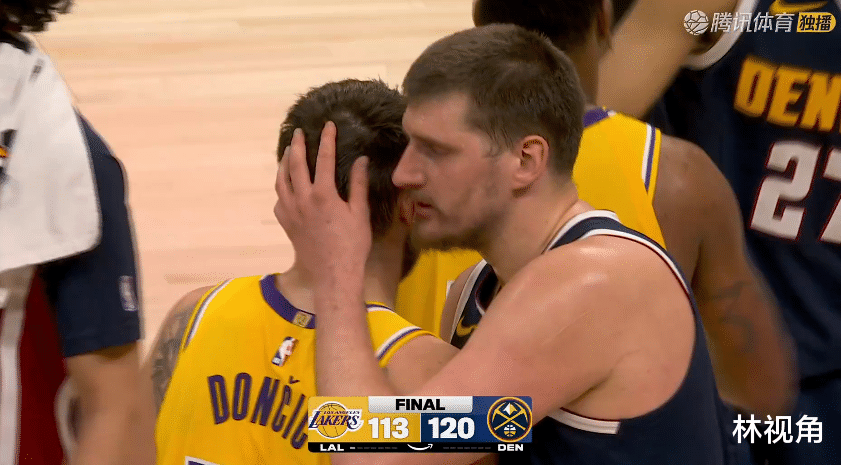 场上两队球员在拥抱致意,显得很友好,约基奇走上前,一把抱住东契奇,还在东契奇耳边说着什么,两人私交很好的。