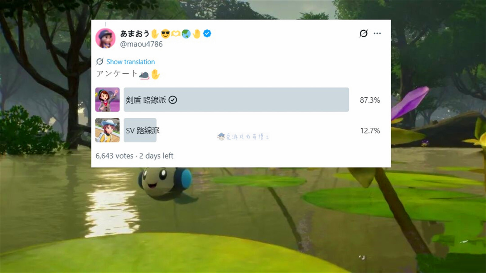 值得一提的是:后续“あまおう”发起了一个投票,目前有6600多玩家参与,结果显示:比起开始走半写实路线的《宝可梦:朱/紫》,超过87%的玩家都更偏爱维持了经典卡通风格的《宝可梦:剑/盾》,可见许多人是坚持和认可传统卡通风格的。不过,博士注意到:“あまおう”千万观看贴文的点赞数量只有2.5万,以及留言中也有不少反对意见,这意味着也有不少人并不排斥《宝可梦:风/波》的视觉进化效果。