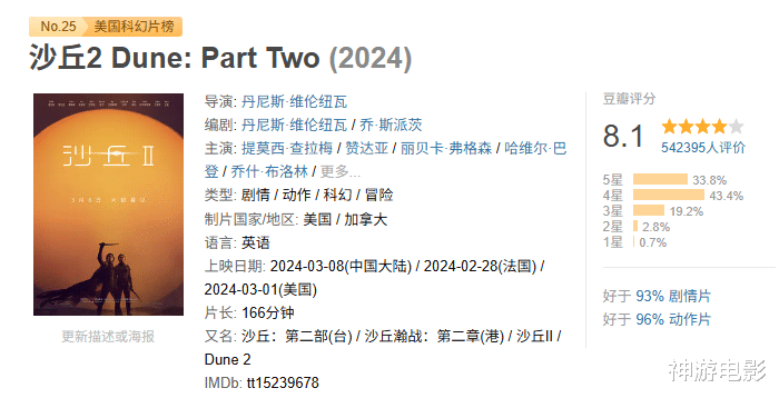 《沙丘2》更是在豆瓣上稳拿8.1分,烂番茄新鲜度高达93%,叫好又叫座,直接把续作的期待值拉满 。