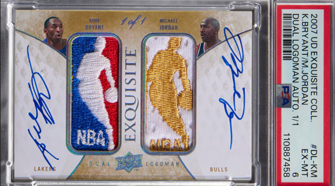 这张打破世界纪录的球星卡(见下图),于2007-2008赛季后发行。除了乔丹和科比这两位篮球巨星的亲笔签名外,还分别插入了芝加哥公牛队和洛杉矶湖人队当时球衣所用的NBALOGO实物。这张卡世上只有一张,由于科比已经过世,所以往后也无法复制,因此它的独一无二性奠定了它的价格基础。