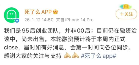 团队在12日的博文回应中首先澄清关键信息:“我们是95后创业团队,并非00后;目前仍在融资洽谈中,尚未出售。”团队透露,本轮融资预计于本周内正式完成,届时将第一时间同步进展。有趣的是,其中一条博文调侃道“也共同期待一下,哪个大厂会第一时间抄袭”,引发网友对行业创新环境的讨论;另一条则坦陈现状:“各路知名互联网大佬、头部投资机构纷纷加好友彻夜长谈,媒体采访邀约应接不暇。”团队直言虽承受巨大精神压力,但愿顶住压力助力创新,并分享座右铭“你我仅有一次生命”,强调“中国人绝不比任何人差劲”。