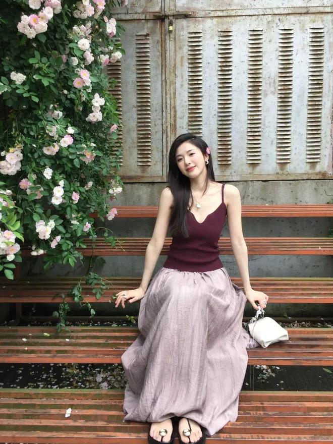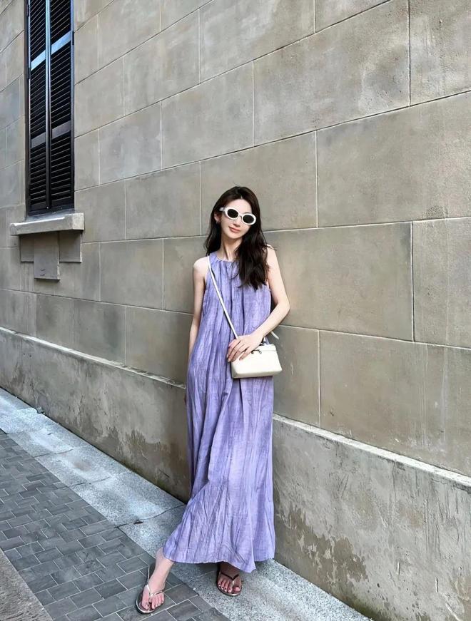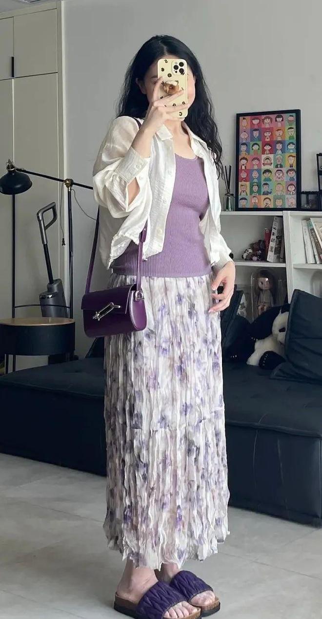 上半身还可选择白色衬衫+紫色吊带,衬衫的材质考虑选择轻盈柔软的面料,如丝绸、棉质或雪纺等,以增加轻盈感和舒适度。