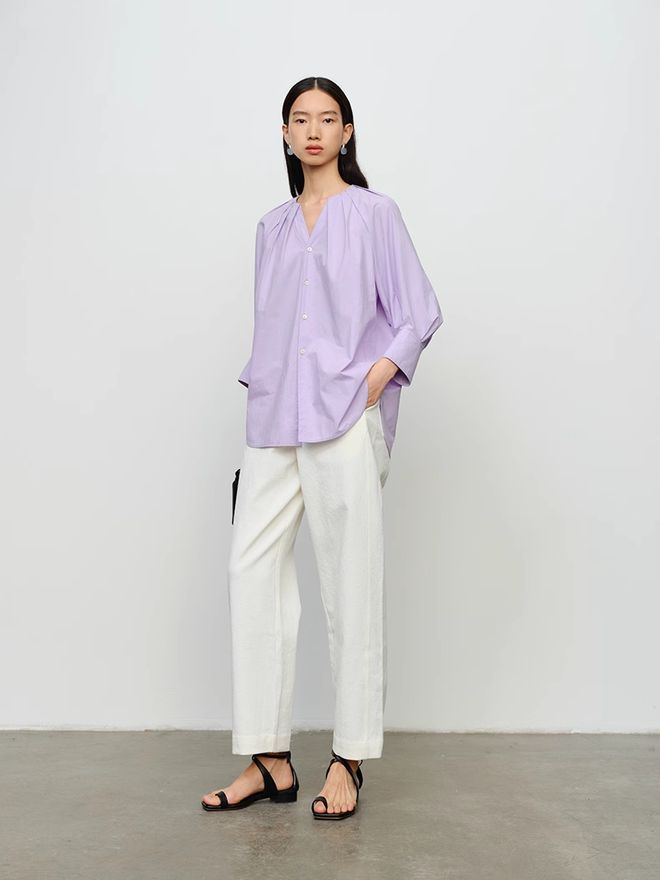 融合了粉调的紫色衬衫更加活力俏皮,在衬衫的率性中加入甜美的气息。