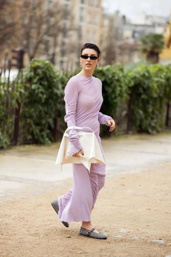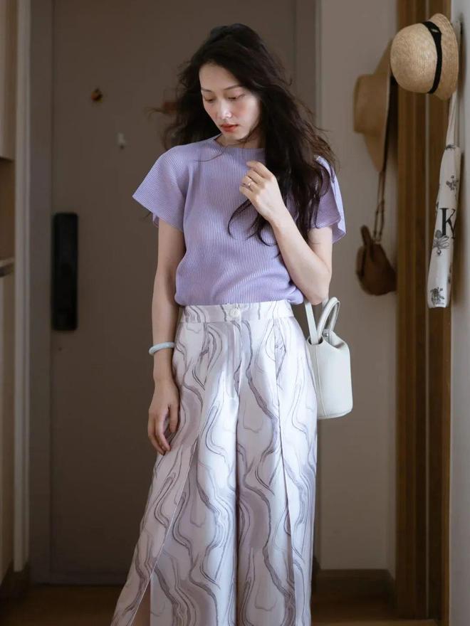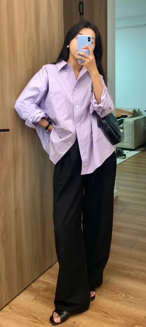 紫色属于冷色系,粉紫色的明度很高,能给人明亮的感觉,在视觉上有“降温”的冰凉感,搭配黑色或深灰的长裤长裙都不会显得厚重单调。