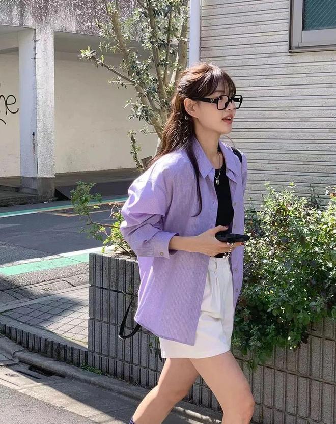 粉色调的紫色衬衫搭配短裤,时髦的毫不费力。