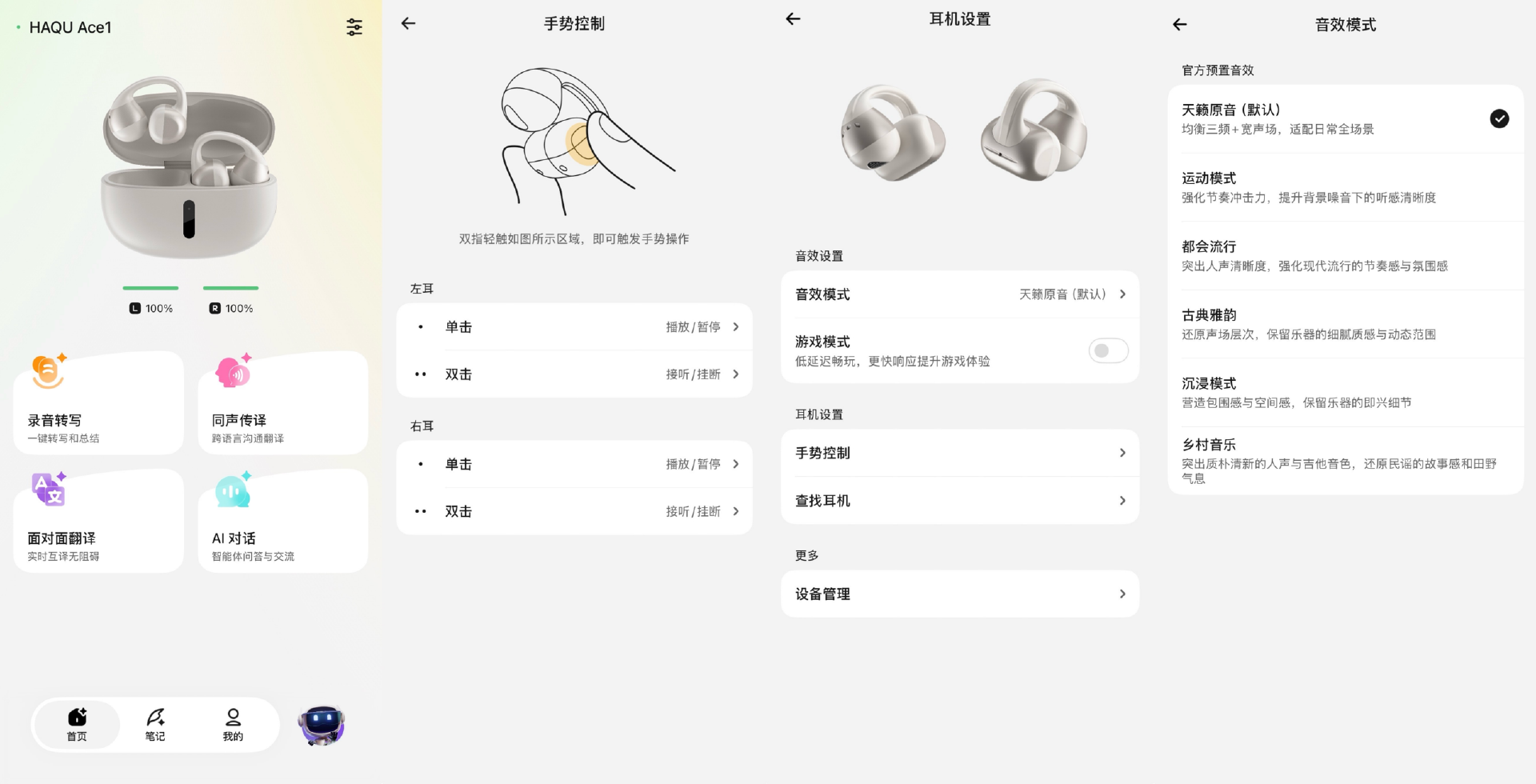 除了耳机本身实力强之外,哈趣Ace1还配套了APP,APP功能非常多,也非常贴心。可以在APP里面设置按键功能,设置6种不同音效,甚至还能设置游戏模式和查找耳机功能,这对于经常丢耳机的我来说实在是太重要了,毕竟我上一个耳机就是这么不翼而飞的。