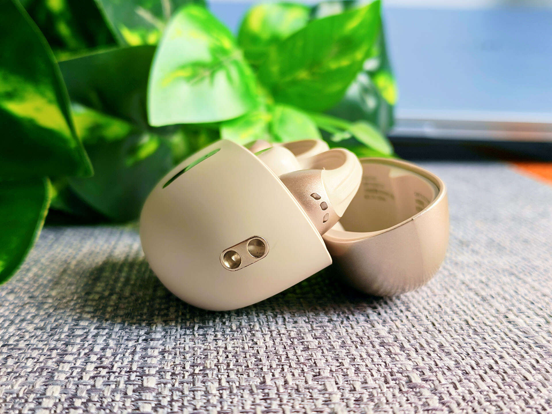 充电仓的形态的话算是中规中矩,整体是圆润的鹅卵石造型,上面是金属磨砂的黄色,下面是亲肤涂层的乳黄色,中间还有个黑色椭圆指示灯区域,没有多余的花哨装饰。