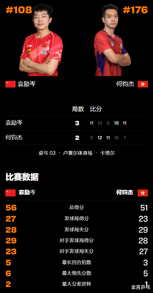 而1997年出生的何钧杰最新排世界第176名,虽然积分比袁励岑更少,但大赛经验更丰富,所以此战对袁励岑来说是一个考验。