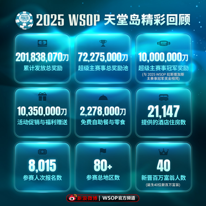 2025 WSOP 天堂岛站,用一连串“破纪录”写下新里程碑:累计发放总奖励达 201,838,070 美元,超级主赛事总奖池 72,275,000美元、冠军奖金 10,000,000美元,整场系列赛来自 80+ 地区的玩家汇聚同场,累计报名 8,015 人次,也在本次赛事诞生 40 位新晋百万美元富翁。