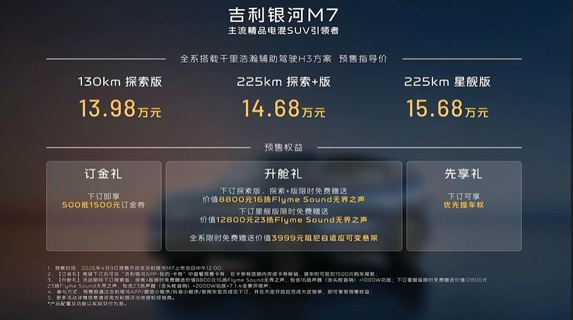 4月9日,银河M7预售开启,价格定在13.98万元至15.68万元之间。这次预售还带了三重权益:500元抵1500元的订金礼、全系限时免费赠送价值3999元阻尼自适应可变悬架的升舱礼,以及优先提车权。