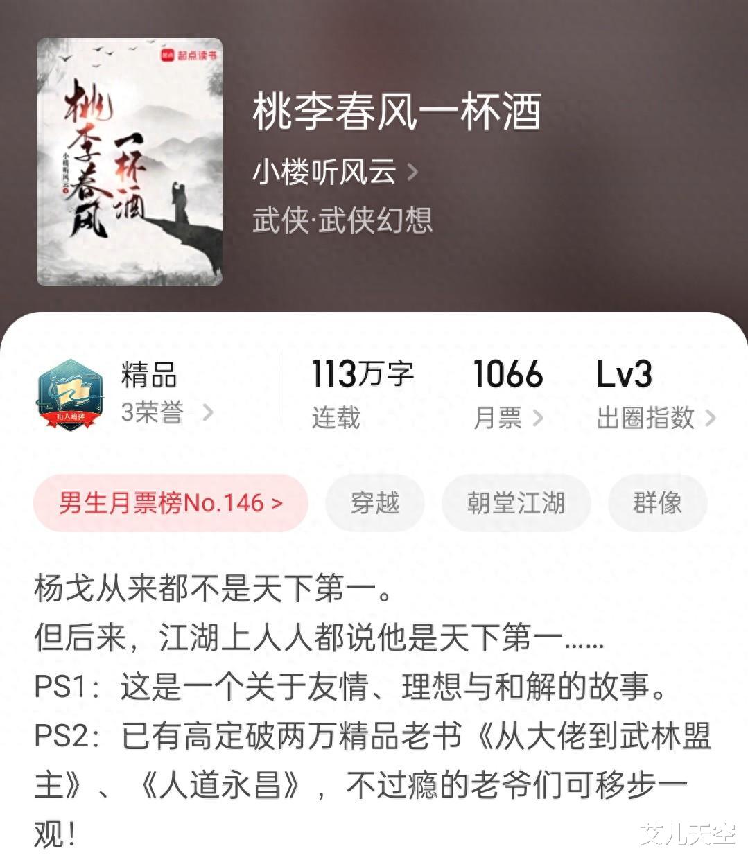 晚上发现“小楼听风云”的作品《桃李春风一杯酒》在今天早上完结了,还是很意外的,毕竟小说没写多久,而且成绩非常不错,竟然没写长点。