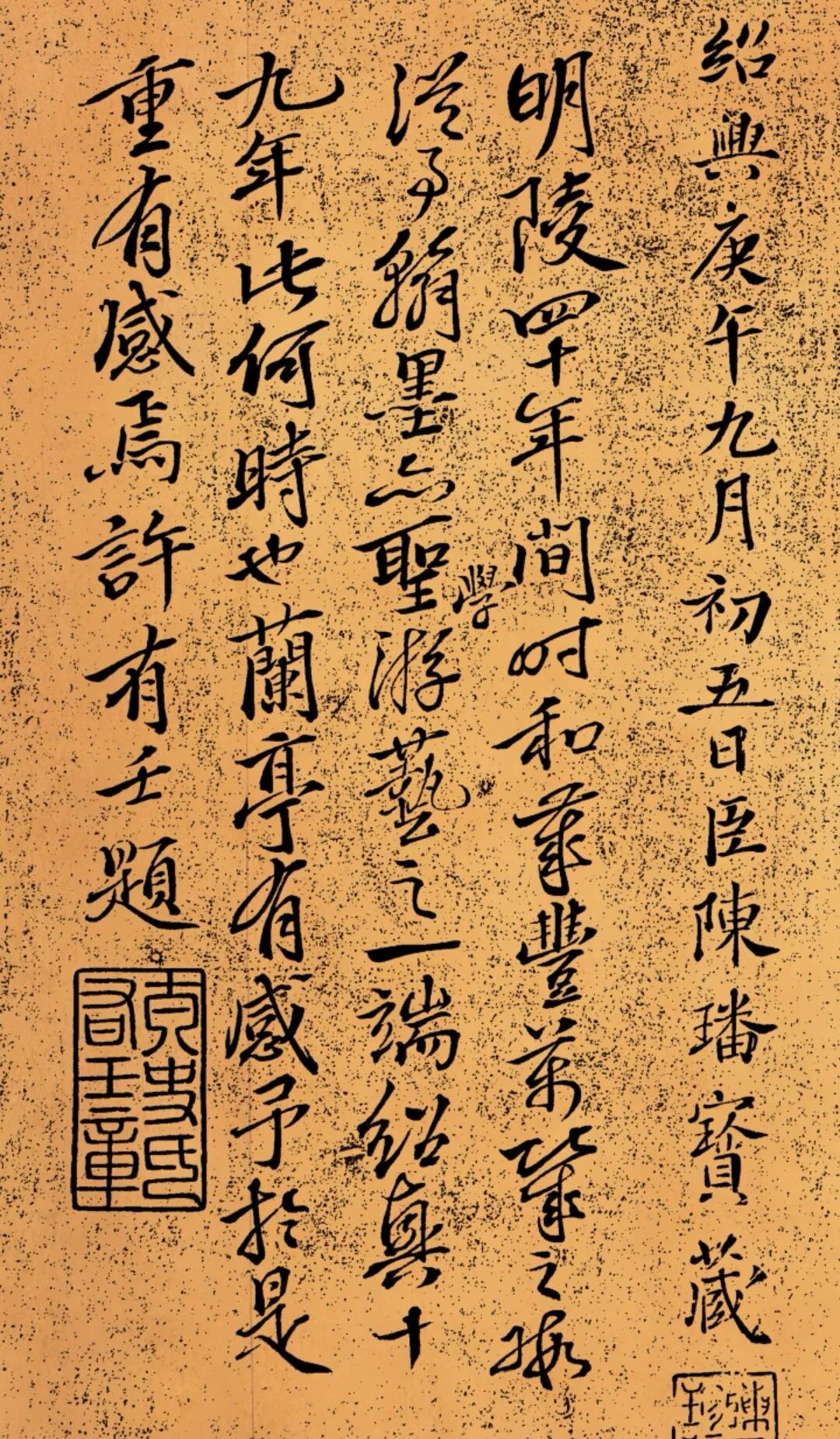 作为帝王临帖,此帖更具特殊文献价值。绍兴十九年的御赐落款,印证了南宋初期文化重建的脉络——赵构虽偏安江南,却以书法传承魏晋文脉,赐给重臣陈康伯的举动,既是文人雅趣的彰显,也是文化正统的延续。而陈璠、许有壬的历代题跋,更让这卷临帖成为多代藏家认可的珍品,背后串联起南宋至元明的文化传承链。