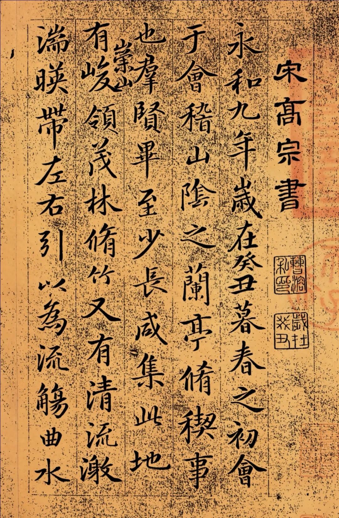 从笔法鉴赏,赵构此帖深得魏晋书法神韵,却又自成一格。落笔婉丽洒脱,起收有度,点画之间灵动自然,没有帝王权柄的刻意厚重,反倒透着文人书家的飘逸灵动。临摹《兰亭》却不囿于原帖形骸,既保留了王羲之“飘若浮云,矫若惊龙”的核心气韵,又融入自身书写习惯,笔画流畅中见筋骨,转折圆润中藏锋芒,将晋代书法的雅致与南宋书风的灵动完美融合。