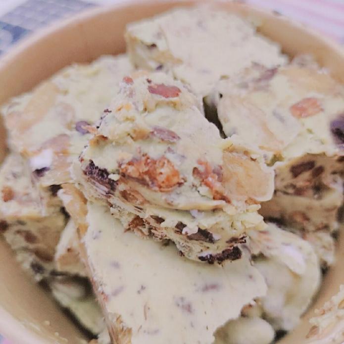 抹茶奥利奥厚切炒酸奶里有奥利奥碎、葡萄干,还添了不少完整的杏仁,吃起来口感丰富不单调,味道也特别好,很值得一试