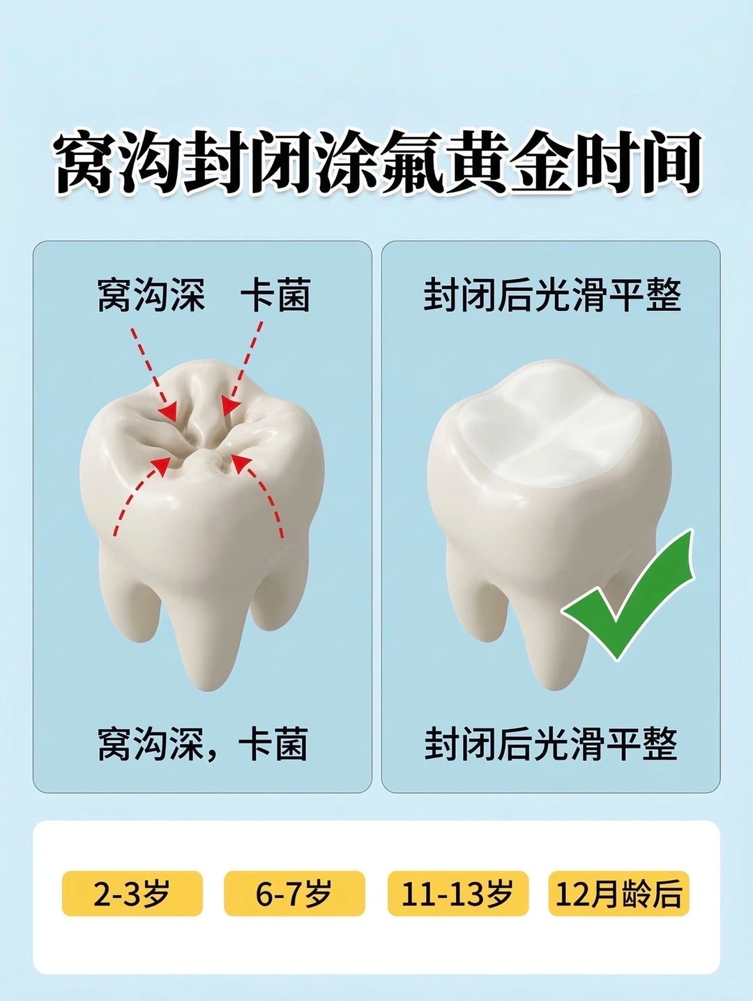 涂氟能全面强化牙釉质,抑制细菌生长,填补微小缝隙;窝沟封闭则彻底填平深窝沟,让牙齿表面光滑易清洁,双重防护覆盖所有盲区。