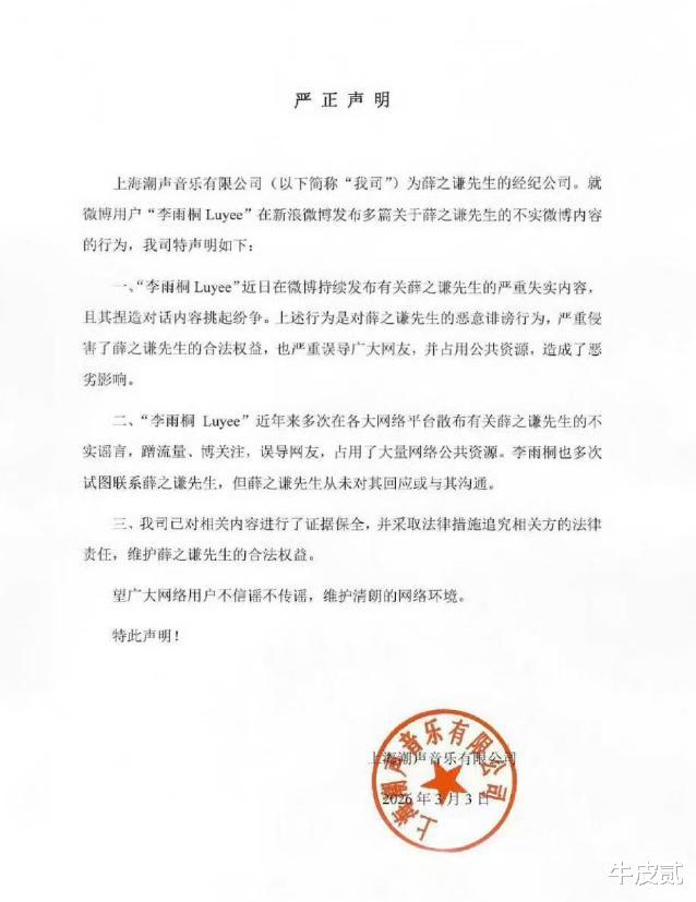 3月2号,李雨桐在网上直接点名举报薛之谦。