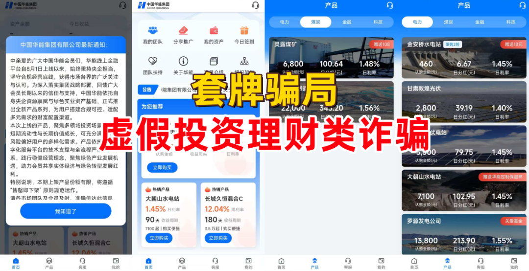 套牌诈骗。不法分子冒充“中国华能集团”公司的名义,制作散布涉诈APP,虚构推广“电力”“煤炭”“金融”“科技”等高额返利理财项目,采用传销模式发展下线。