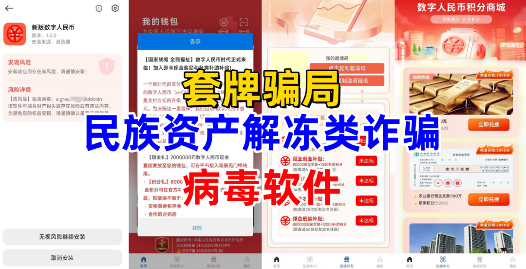 套牌诈骗。不法分子冒充“数字人民币”的旗号,制作散布涉诈APP,声称实名注册,可领取5000现金补贴,数字积分补贴,积分可兑换黄金、房产、现金支票等,发展下线可获得“教育补贴”“就业创业补贴”现金奖励、积分奖励等。