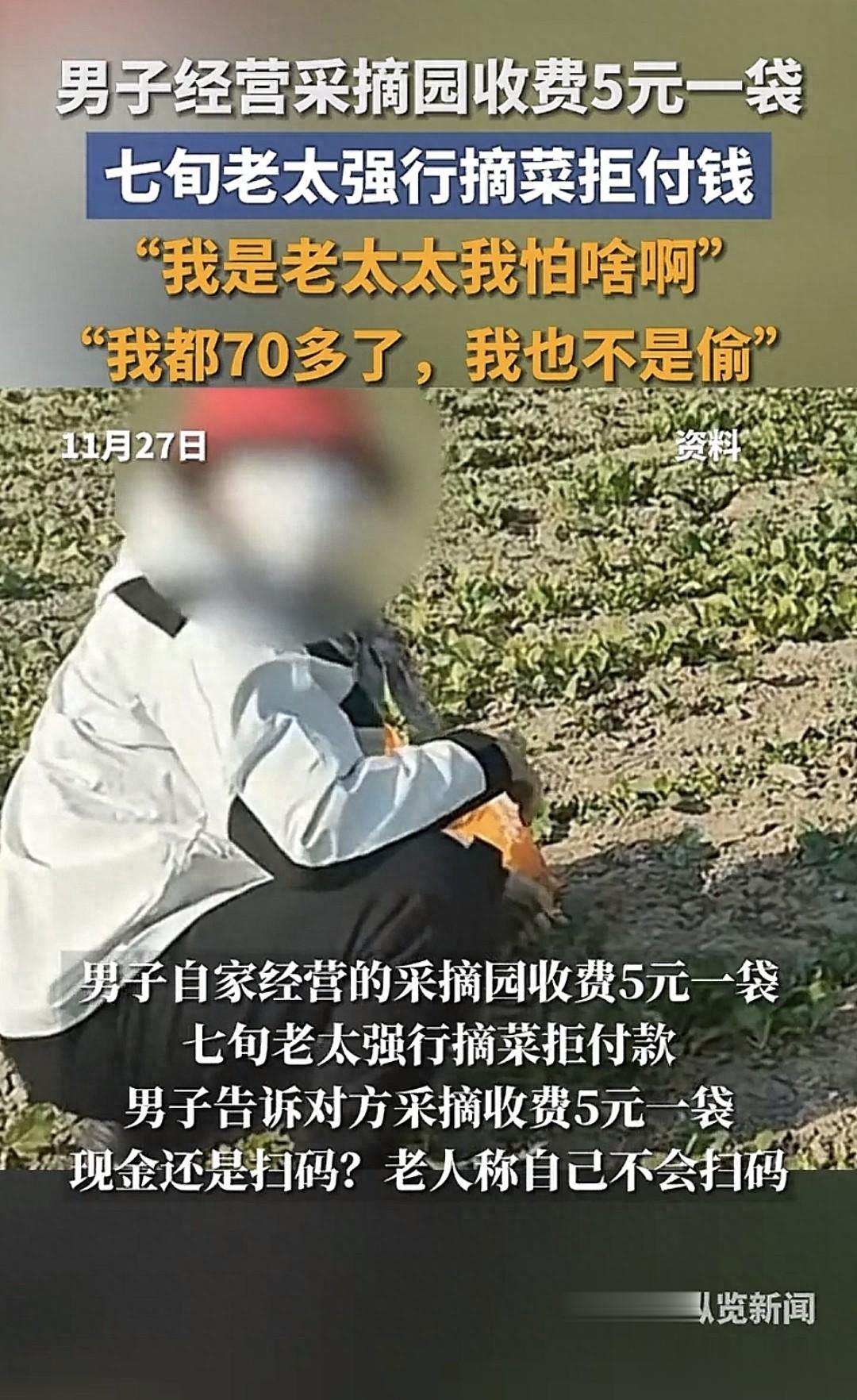 老太上来就直接强行采摘,一边摘还一边嘴里捣鼓。男子在旁边告知收费5元一袋,可以网上扫码也可以现金,老太却说没钱我也不会网络支付。