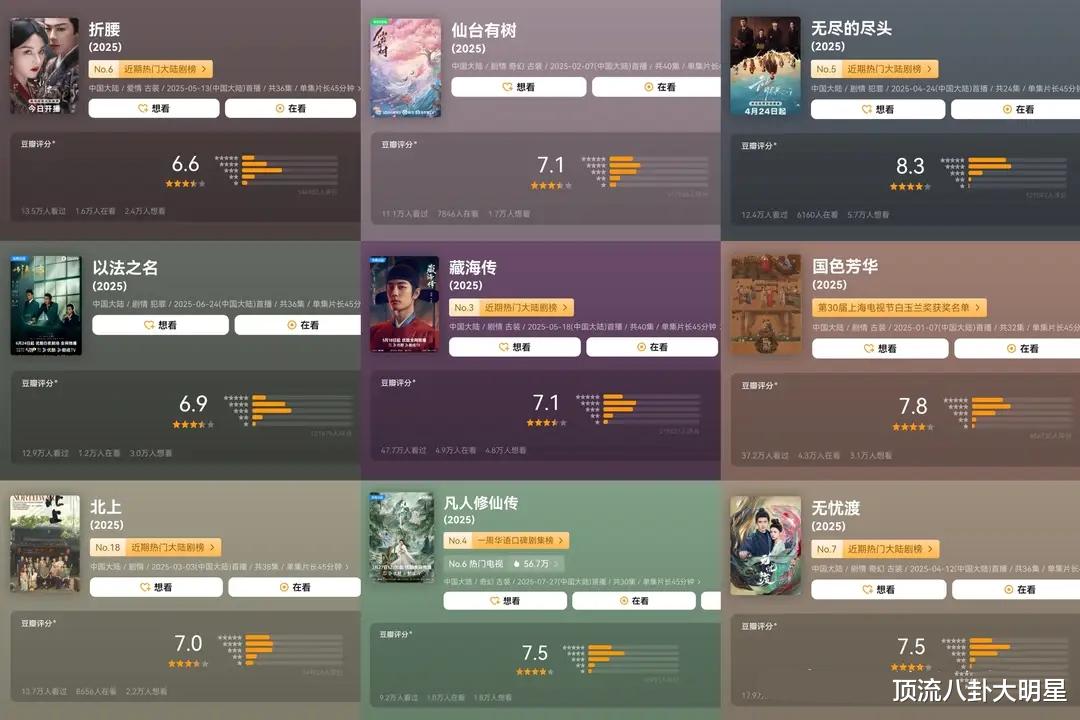 25年已经下半年了,内娱上半年爆款剧频出:有古装权谋复仇剧,刑侦剧、奇幻悬疑探案剧、古装励志传奇剧、青春成长年代剧、古装仙侠剧、未成年人保护司法剧等,演员阵容强大:有肖战、任嘉伦、刘宇宁、杨紫、白鹿、张译等的,每部剧都杀得平台措手不及,大有不分出高低誓不罢休的架势,看看你看过几部?
