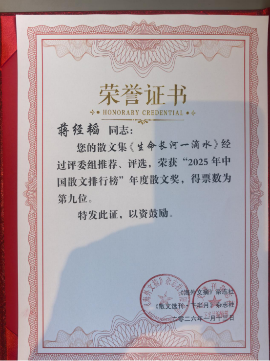 1月12日至14日,由《海外文摘》《散文选刊》与信阳文新毛尖集团联合主办的“2025年中国散文排行榜”颁奖会在河南信阳举行。湖北作家蒋经韬的散文集《生命长河一滴水》脱颖而出,荣登该榜第九名。