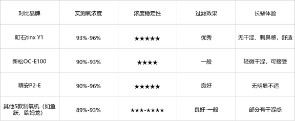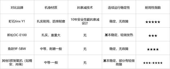 表现良好的5款机器,机身材质中等,连续运行24小时基本稳定,没有出现明显故障,但都没有抗衰减技术,长期使用后,氧浓度可能会出现衰减,需要定期维修保养,耐用性比町石tinx Y1略差。