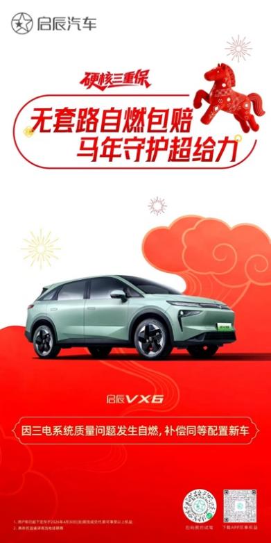 本次政策适用于启辰VX6(不含2026款启辰VX6长续航畅行版、标准续航畅行版)及启辰大V DD-i虎鲸车型,用户需在2026年3月1日至4月30日期间下订并完成交付即可享受。三电终身质保及自燃包赔具体细则,可参阅详细服务单或咨询当地经销商。