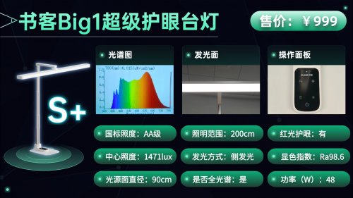 在硬件配置上,书客Big1延续了对极致护眼的坚持,搭载五阶光学引擎,把传统台灯的亮度调节升级为覆盖多种使用场景的护眼光环境。,同时配合上高频率无频闪的PLP光电处理器,实测光波动控制在≤0.05%,让人几乎感知不到任何频闪风险。色彩表现方面,它严格遵循TM-30光学标准,不仅实现Ra98.6超高显色指数,更将色彩饱和度调控至满分,呈现出自然、真实、接近自然光的视觉效果。在智能功能上,书客Big1同样全面升级,支持入座感应及缓开缓灭等操作,让护眼与高性能完美融合。整体性能可媲美高端护眼大路灯,轻松领先同价位竞品,彰显行业顶尖技术实力与卓越使用体验。