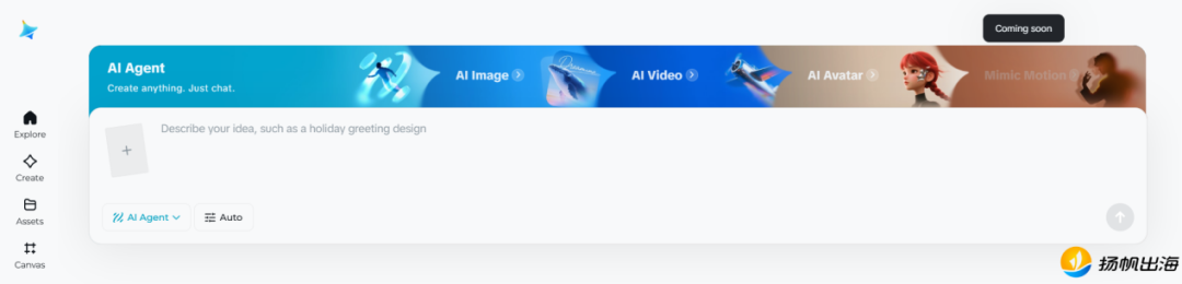 从功能结构来看,Dreamina AI 可分为三大板块:AI 生图、AI 生视频、AI 生成数字人。值得注意的是,产品在功能展示中还预留了“模仿动作”的 AI 能力,并标注“即将推出”,显示出其创作能力的持续扩展性。