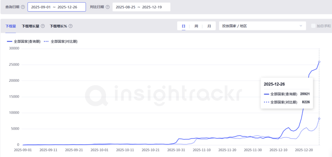 根据Insightrackr数据,自上线至2025年12月26日,Dreamina AI海外12国累计下载量约为29.5万(iOS与Google Play双端)。下载曲线显示,增长主要集中在12月中下旬,12月26日单日下载量提升至近2.6万。
