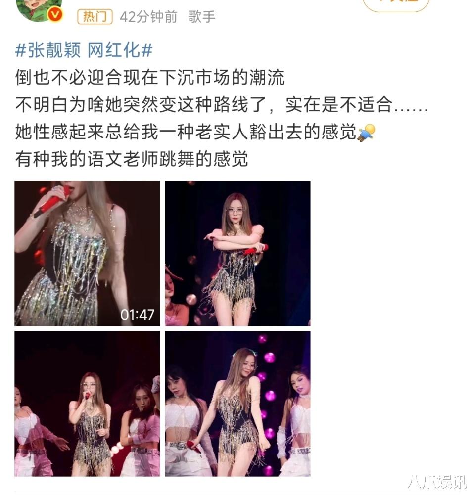 争议骤起——当“教科书”陷入“网红化”质疑然而,同样的“金丝眼镜杀”,在两个月后的深圳个人演唱会上,却遭遇了截然不同的评价风暴。当张靓颖身着欧美风紧身流苏装,佩戴同款金丝眼镜,以更大幅度、更具力量感的扭胯、甩头等热辣舞蹈演绎《九万字》时,舆论风向瞬间逆转。部分网友直指其表演“风俗感太重”、“像擦边女网红”,甚至扣上“自降身价”、“华语乐坛的悲哀”等尖锐帽子。批评者认为这与她实力唱将的定位严重不符,质疑她是否在迎合低级趣味。