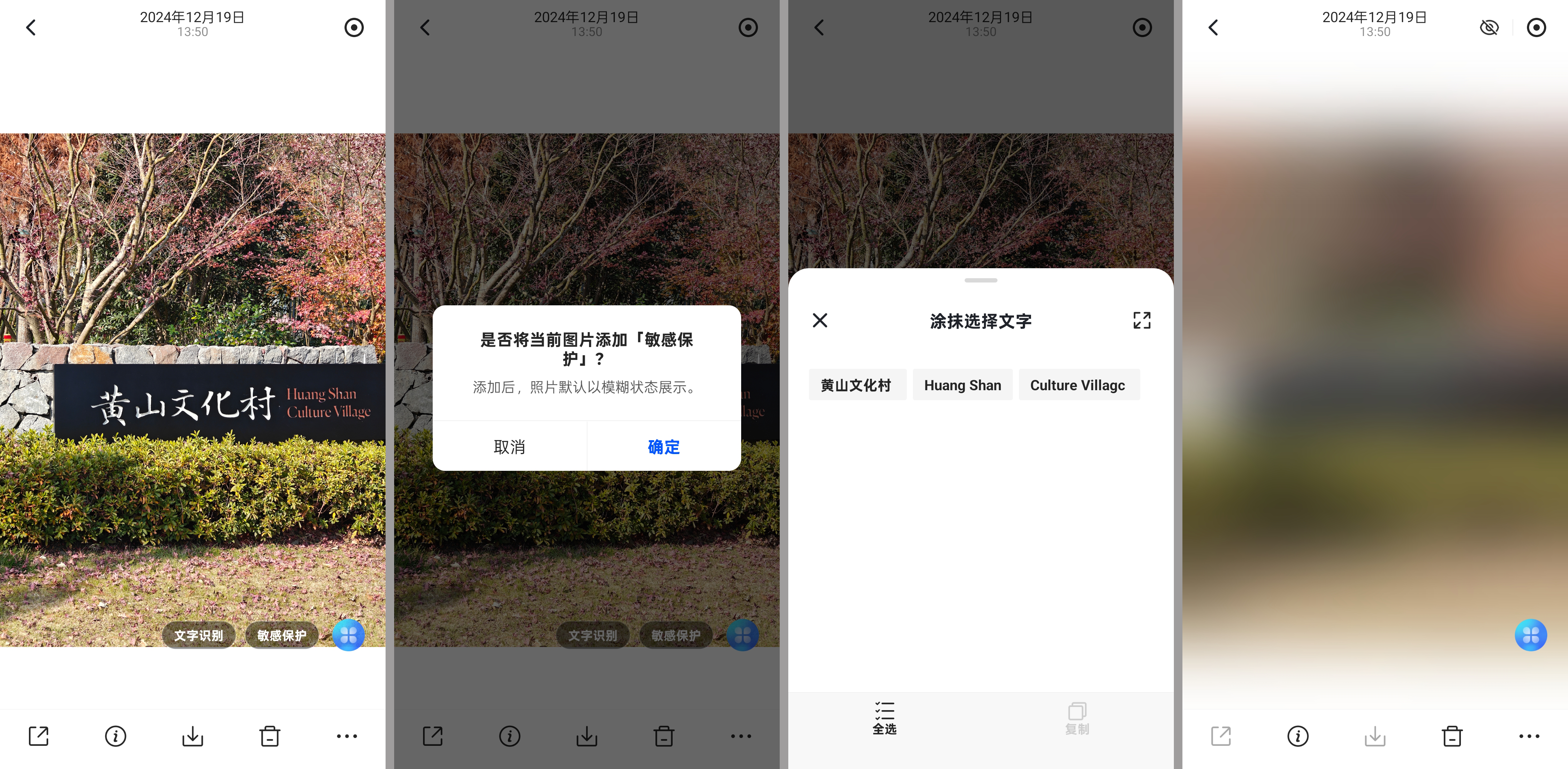 此外,相册还带有文字识别和敏感保护功能,遇到不方便展示的内容,可以一键模糊,不对任何人展示。