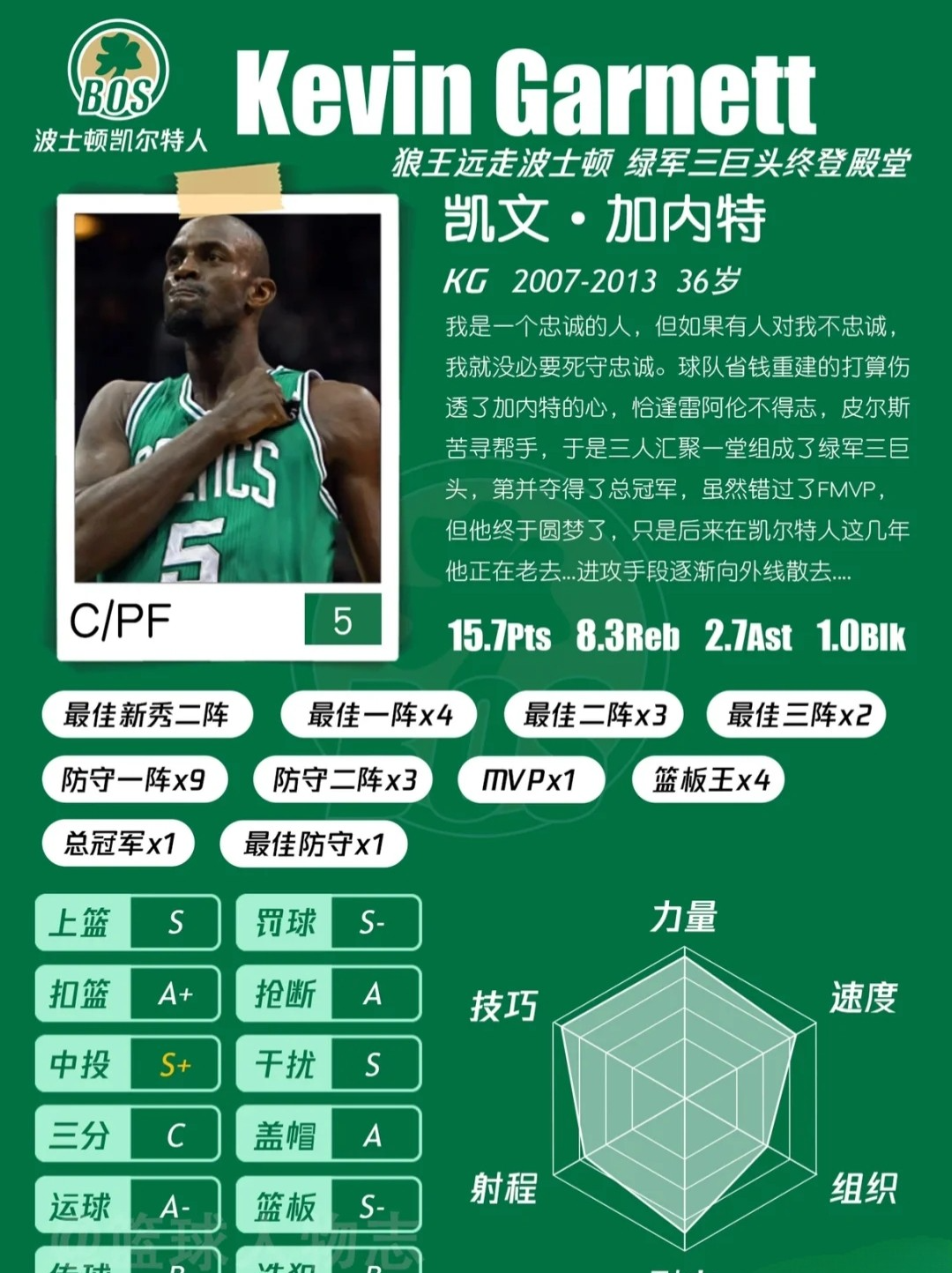 · 防守核心与总冠军(2007-08赛季):这是加内特凯尔特人生涯的巅峰。他成功转型为球队的防守中坚,当之无愧地荣膺年度最佳防守球员。他带领凯尔特人打造了历史级别的防守体系,最终击败湖人夺得冠军,完美诠释了领袖价值。